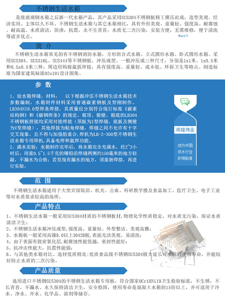 不銹鋼水箱適用于大型賓館飯店、機(jī)關(guān)、公寓、科研教學(xué)樓及食品加工、醫(yī)療衛(wèi)生、電子工業(yè)等對(duì)水質(zhì)要求較高的場(chǎng)所。(注:水中氯離子含量高者慎用)