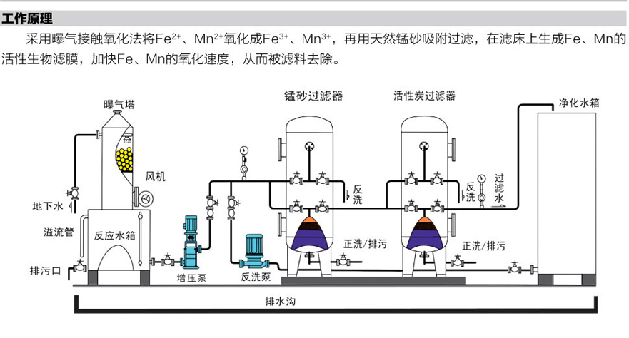除鐵錳過濾罐是通過均質(zhì)等粒徑錳砂形成砂床,作為過濾載體從而進行立體深層過濾。其過濾精度視砂粒大小而定。過濾時:水從罐體上部的進水口流入,通過砂石介質(zhì)層孔隙向下運行滲透,雜質(zhì)被隔離在砂石介質(zhì)層上部。過濾后的凈水經(jīng)過過濾器底部的過濾元件進入出水口流出,即完成水的過濾過程。如果處理水量較大,應(yīng)多臺并聯(lián)使用。可過濾綠藻、漂浮物等。。